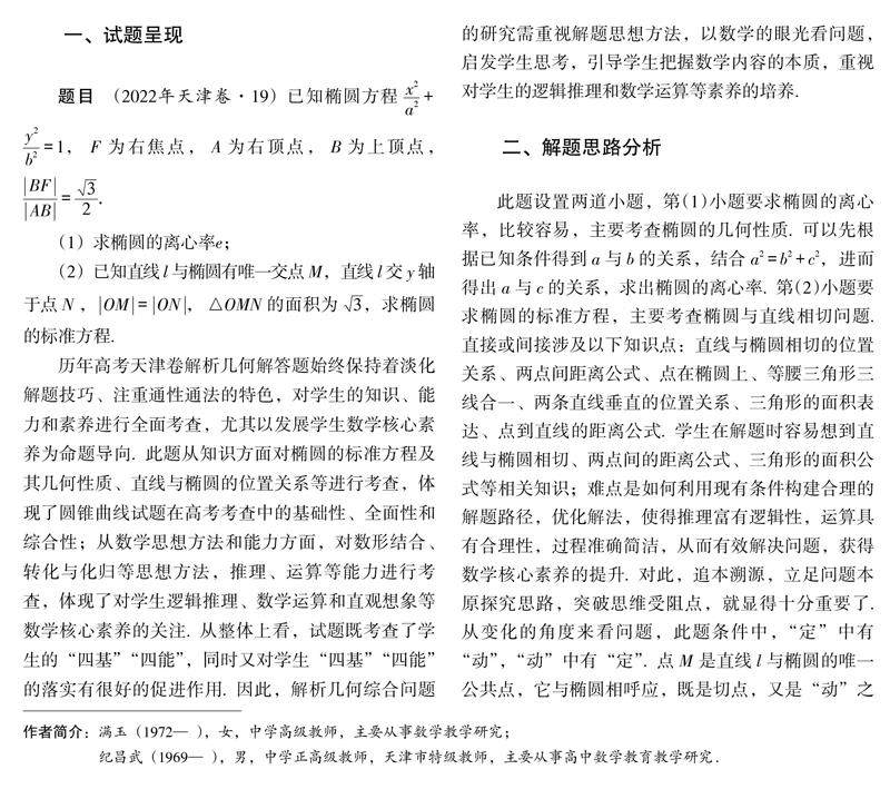 摘 要:以2022年高考天津卷第19题的解法研究为例,探究在解析几何解答题教学中如何立足问题本原探索解题思路,培育学生的数学运算和逻辑推理素养.