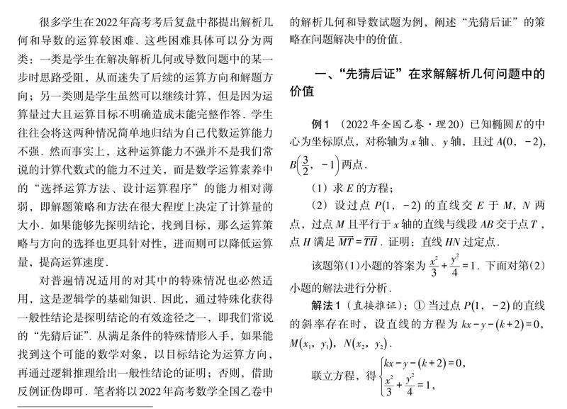 摘 要:“先猜后证”是一种通过特殊化获得一般性结论的推理方法,这是探明结论的有效途径之一. 在解析几何、导数难题的解答中,通过猜想可以明确目标,从而使运算策略与方向的选择更具针对性. 以2022年高考数学全国乙卷中的一道高考试题为例阐释上述思路方法的应用,分析其对解题与教学的意义和价值.(剩余1847字)
