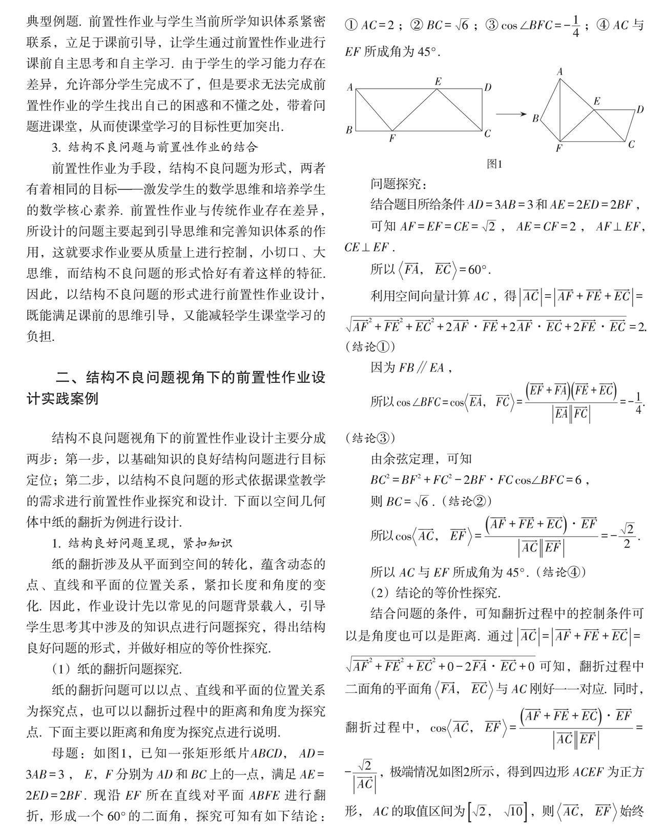 摘 要:“双减”政策对作业提出了新的要求,迫切需要改变作业的现状. 而现有的关注点大多数在课后作业,对于课前作业重视不够,未能有效利用前置性作业引导学生自学和培养学生的思维,无法达成课堂教学的顺利过渡. 结合具体实践,通过常见的纸的翻折问题,从结构不良问题视角对不同课型进行前置性作业设计(剩余6632字)