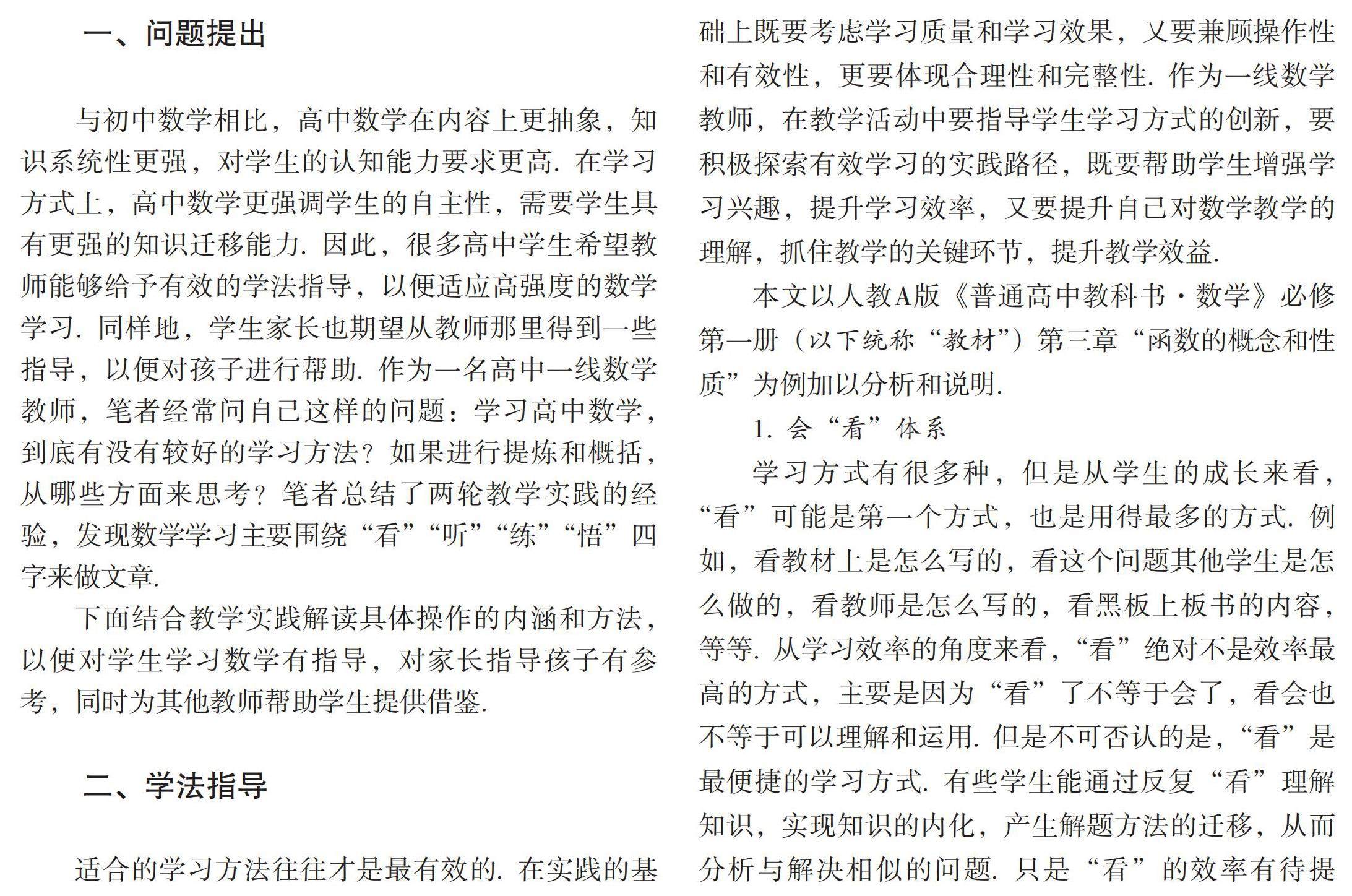 摘 要:基于教学实践,提出“看”体系、“听”逻辑、“练”技能、“悟”素养的高中数学学习方法,旨在帮助一线教师明确教学的关键环节,做好学生的学法指导.
