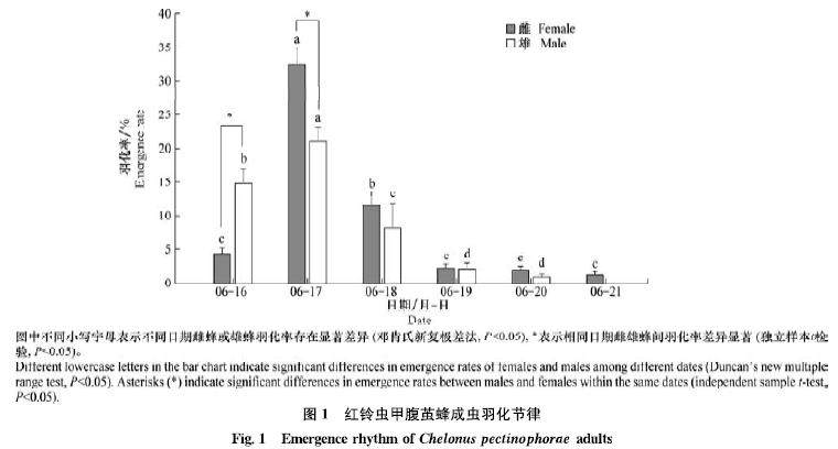 红铃虫甲腹茧蜂Chelonus pectinophorae是一种跨卵幼虫期的寄生蜂。为有效挖掘该寄生蜂的生防潜能,使其能够应用于田间生产,本研究借助录像设备观察并分析了其生物节律和寄生行为。结果表明,红铃虫甲腹茧蜂羽化期约6 d,70%个体集中在前3 d羽化,第1天雄蜂的羽化率显著高于雌蜂,90%以上蜂茧在6:00-12:00羽化。(剩余10321字)