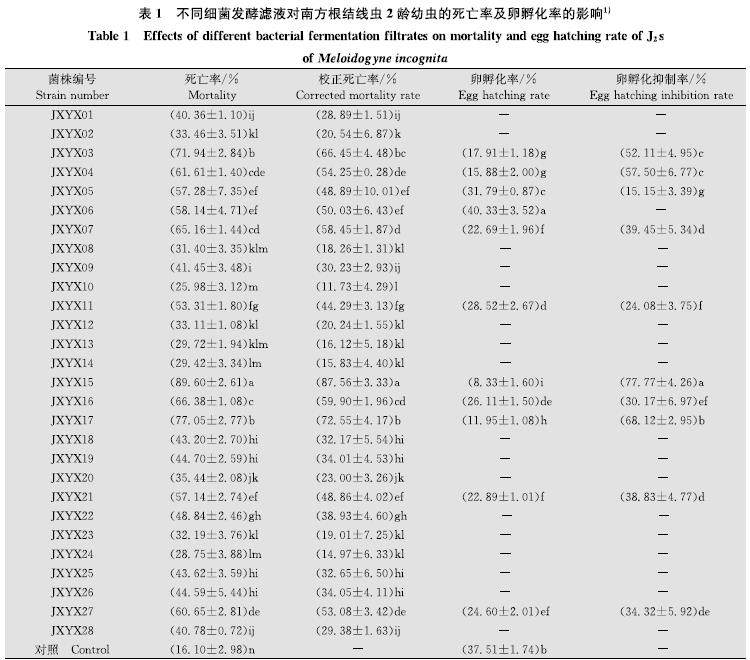 为寻求新的生防资源,本研究从山药中分离筛选出1株对南方根结线虫Meloidogyne incognita 2龄幼虫具有较强毒杀活性且抑制卵孵化的细菌菌株JXYX15。综合形态特征、生理生化特性和分子进化分析结果,鉴定菌株JXYX15为芽胞杆菌 Bacillus sp.。菌株JXYX15发酵液和发酵滤液对南方根结线虫2龄幼虫均具有较高的毒杀效果,原液处理后24 h幼虫的校正死亡率分别为87.89%和88.59%,且未稀释的发酵滤液对卵的孵化抑制率达到80.33%。(剩余16665字)
