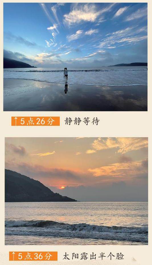 我们迎着清爽的海风来到沙滩上,只见天空穿着一件暗蓝色的袍子,海面蒙着一层灰黑色的云雾。太阳还无处可寻,人们伫立在沙滩上,静静地等待着日出的第一束光芒。