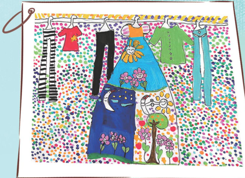 一朵花、两朵花挂在花裙子上。花儿叫:太阳公公快来帮帮忙!”太阳公公马上回答说:“来了!说一说,要什么?”花儿说:“要阳光,洒在我身上!”太阳公公说到做到,阳光如同一支神奇的画笔,给花裙子染上了金色的光芒