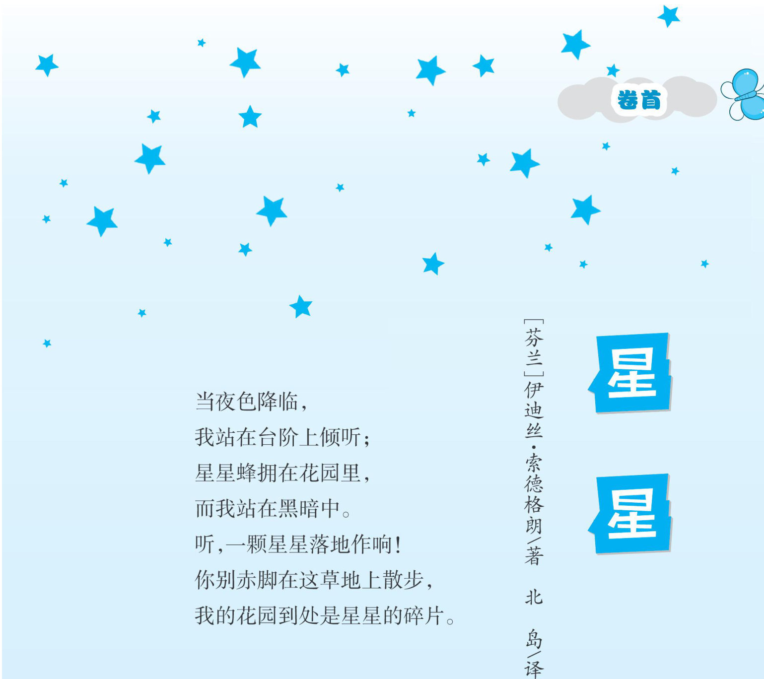这首诗想象奇特,起始就营造了一种神秘而充满梦幻的氛围,我们仿佛看见一个小女孩坐在台阶上倾听星星的秘语,呼吸着花园里散发出来的花朵的芬芳。这是梦的花园,“我”隐身于“黑暗”中,眼前却是那样明亮璀璨。(剩余165字)