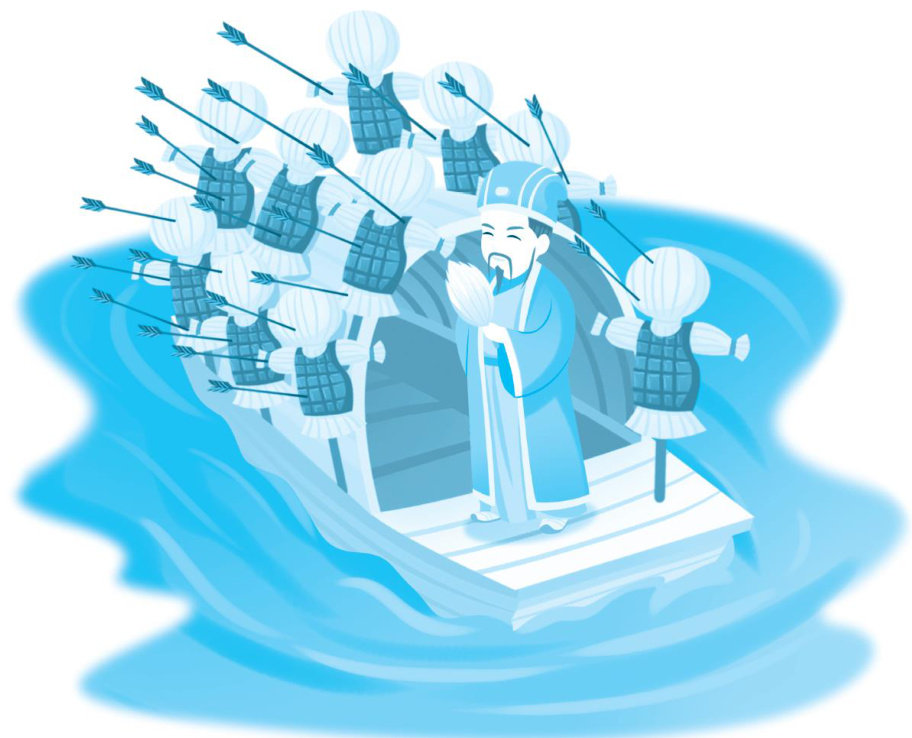 有一天,周瑜请诸葛亮前来议事,故意问他,与曹军水上交战,用什么兵器好?诸葛亮回答说用箭最好。周瑜就让诸葛亮三天内造好十万支箭用于抵挡曹操,诸葛亮当场立下了军令状。