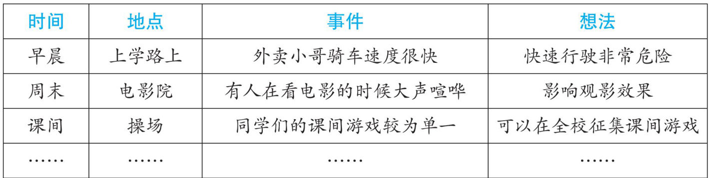 写作时,要努力把你的问题和想法写清楚。先简要介绍你关注的问题,以及你对这个问题的想法;再详细描述现象、分析问题并提出改进建议,这部分是文章的核心,可以大胆表达见解,“我手写我心”;最后总结自己的观点,倡导读者关注这一问题并采取行动。写完后,读给同学听,看看他是否明白你的想法,再问问他对这个问题有什么看法,借此补充修改自己的想法;还可以参加班级想法分享会,说不定你的想法很快就能变成现实呢!