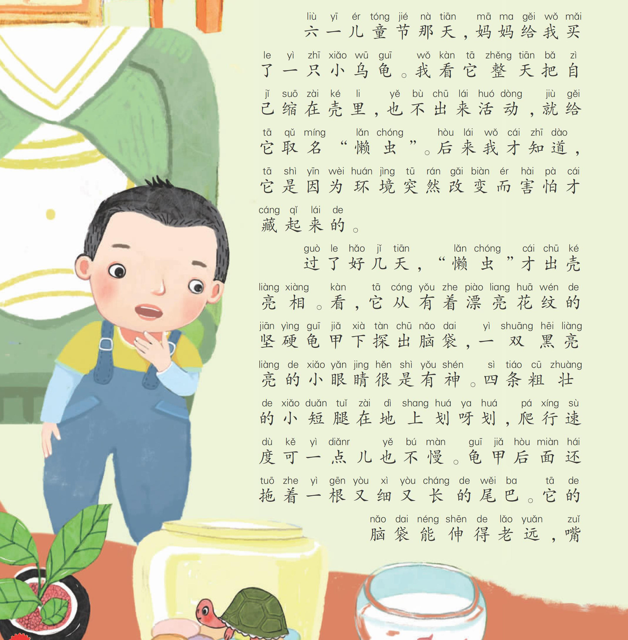 六一儿童节那天,妈妈给我买一只小鸟龟。我看它整天把自己缩在壳里,也不出来活动,就给它取名“懒虫”。后来我才知道它是因为环境突然改变而害怕才藏起来的。