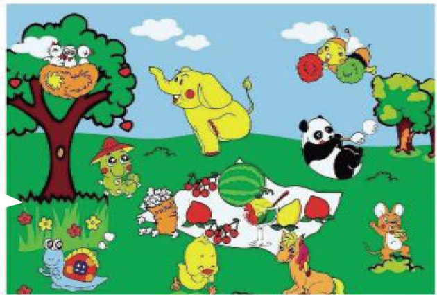 小动物们野餐啦!它们吃啊,玩啊,唱啊…你看多热闹啊!仔细观察图片,写一则小故事吧!