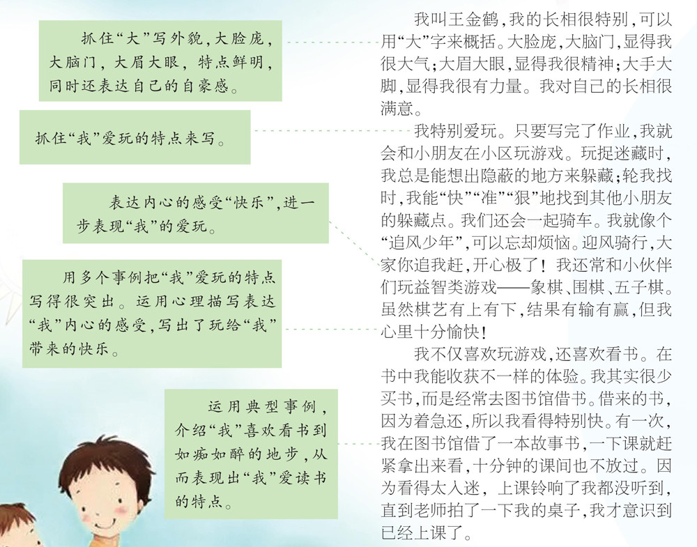 我叫王金鹤,我的长相很特别,可以用“大”字来概括。大脸庞,大脑门,显得我很大气;大眉大眼,显得我很精神;大手大脚,显得我很有力量。(剩余1223字)