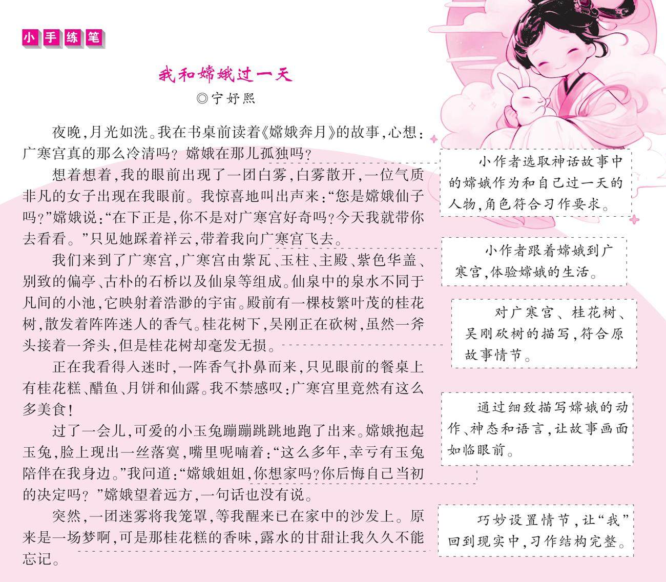 夜晚,月光如洗。我在书桌前读着《嫦娥奔月》的故事,心想:广寒宫真的那么冷清吗?嫦娥在那儿孤独吗?