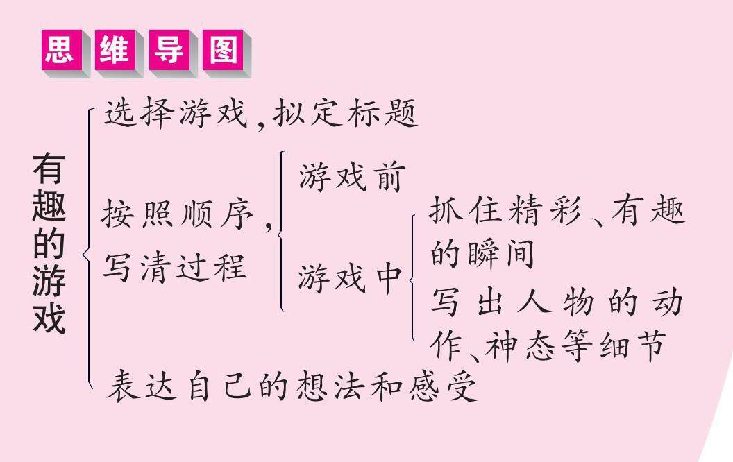 丢沙包、抢椅子、跳长绳、两人三足跑、一二三木头人……游戏可以锻炼我们各方面的能力,可以让我们进入自由自在的快乐天地。今天,我们先一起来玩一个游戏。这个游戏可以是个传统游戏,也可以是个新游戏;可以是室内的,也可以是室外的。做完游戏后,把这个游戏写下来,也可以写以前和其他人一起玩过的游戏。
