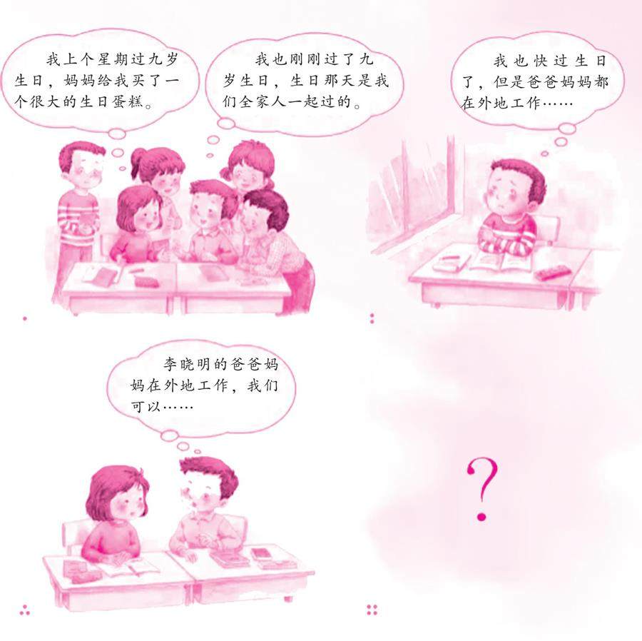 续写之前,我们要认真观察三幅图片,读懂故事。看看图中有哪些人物,根据对话提示,猜测发生了什么事。然后以简短的语言概括三幅图的大意,如:课间,同学们兴致勃勃地讨论过生日的欢乐场景,李晓明失落地坐在座位上,因为他也快过生日了,可是爸爸妈妈都在外地工作。(剩余519字)