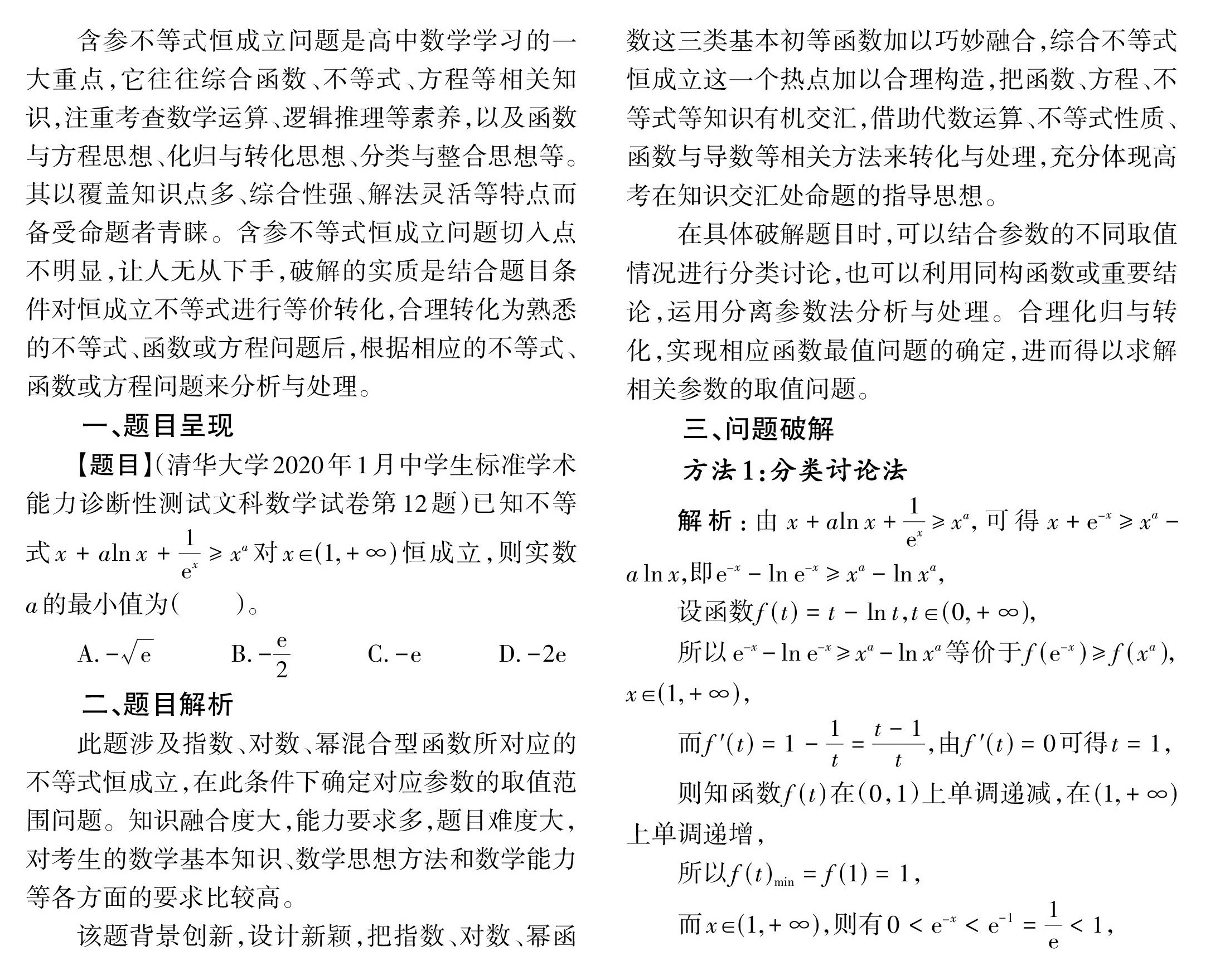 [摘 要]含参不等式恒成立问题是高中数学学习的一大重点,它以覆盖知识点多、综合性强、解法灵活等特点而备受命题者青睐,而同构思维法是破解此类问题的常见思维方法之一。