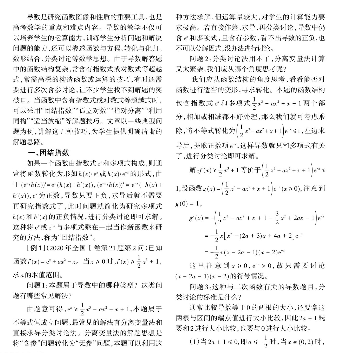[摘 要]导数是研究函数图像和性质的重要工具,也是高考数学的重点和难点内容,利用导数可以更好地研究函数的性质,更准确地作出函数图像。教师在教学中应注意从函数结构的特点出发,引导学生分析具体函数的结构,并根据不同的函数类型给出针对性的解决问题的方法。当函数中含有指数式或对数式等超越式时,可以采用“团结指数”“孤立对数”“指对分离”“利用同构”“适当放缩”等解题技巧。(剩余482字)