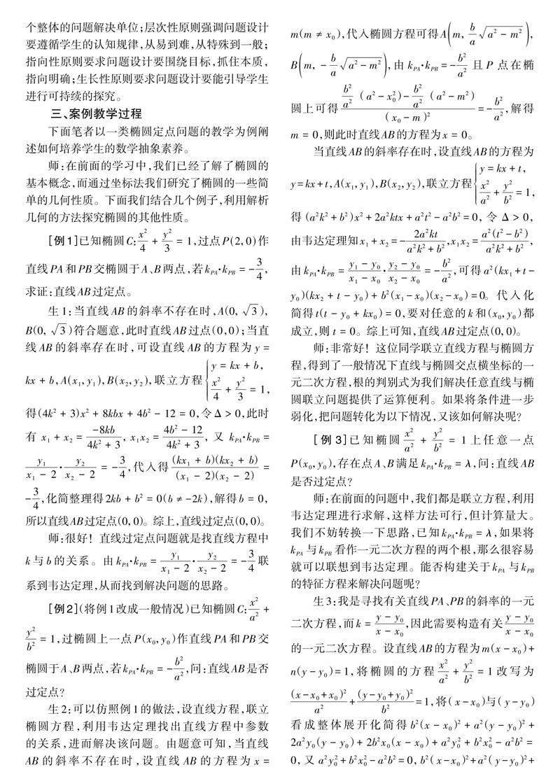 [摘 要]学科核心素养是育人价值的集中体现,数学学科核心素养中的数学抽象素养是数学的基本思想,是形成理性思维的重要基础,数学抽象素养的培养尤为重要。文章以一类椭圆定点问题的教学为例,阐述如何通过设计探究教学活动,引导学生把特殊的问题抽象为一般的结论,从而培养学生的数学抽象素养。