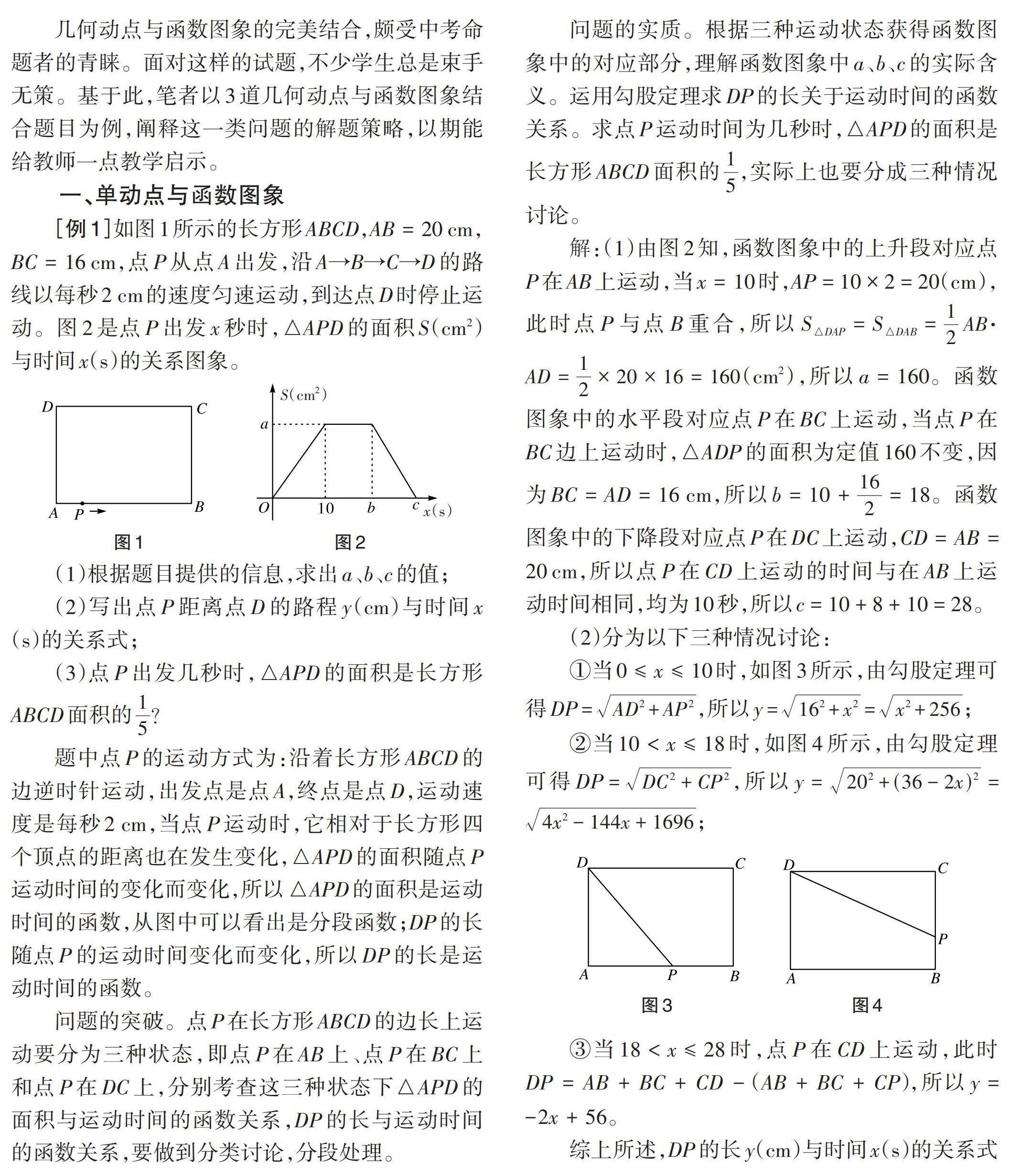 [摘 要]文章以3道几何动点与函数图象结合题目为例,阐释这一类问题的解题策略,旨在引导学生理解动点与函数的本质,进而切实提升学生的思维能力,培养学生的学科核心素养。