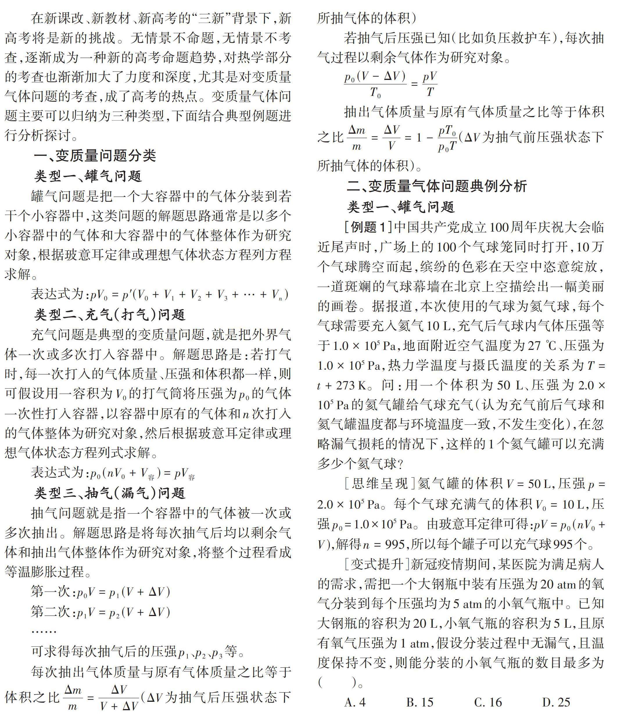 [摘 要]巧妙灵活地选择研究对象,可将变质量气体问题转换成定质量气体问题,再根据理想气体状态方程或气体实验定律列方程求解。文章对变质量气体问题进行分类简析,并结合例题探讨其解题思路。