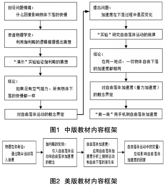 摘 要:分析和比较教材是优化教学过程的重要途径。以“自由落体运动”一节为例,通过对比中美两国高中典型物理教材在教学目标、知识结构、实验设计以及习题编制4个方面的内容,分析中美教材各自的优势,为实际教学提供新的思路。