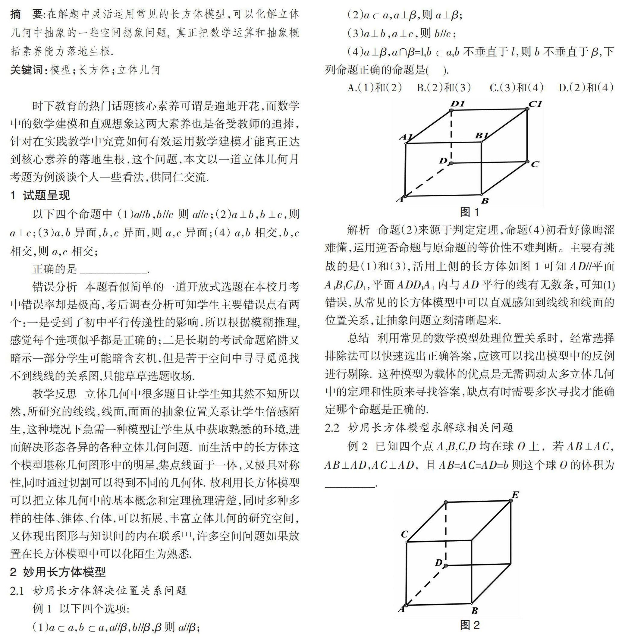 教学反思 立体几何中很多题目让学生知其然不知所以然,所研究的线线,线面,面面的抽象位置关系让学生倍感陌生,这种境况下急需一种模型让学生从中获取熟悉的环境,进而解决形态各异的各种立体几何问题.而生活中的长方体这个模型堪称几何图形中的明星,集点线面于一体,又极具对称性,同时通过切割可以得到不同的几何体. 故利用长方体模型可以把立体几何中的基本概念和定理梳理清楚,同时多种多样的柱体、锥体、台体,可以拓展、丰富立体几何的研究空间,又体现出图形与知识间的内在联系[ 1 ],许多空间问题如果放置在长方体模型中可以化陌生为熟悉.