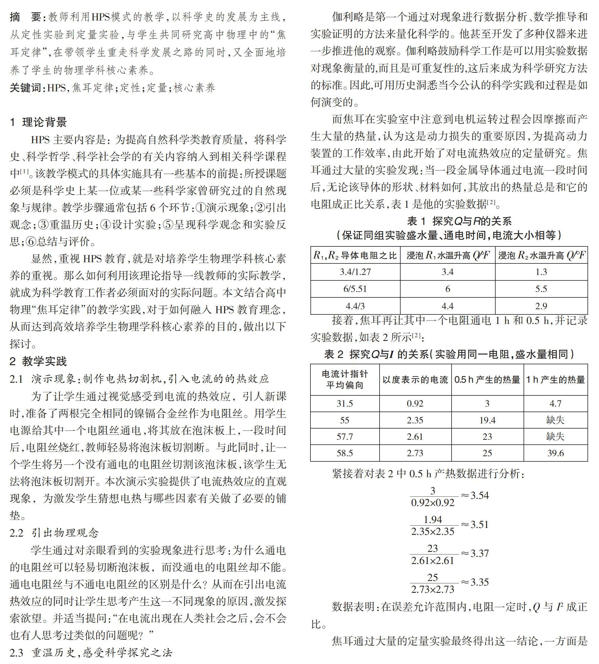 关键词:HPS,焦耳定律;定性;定量;核心素养