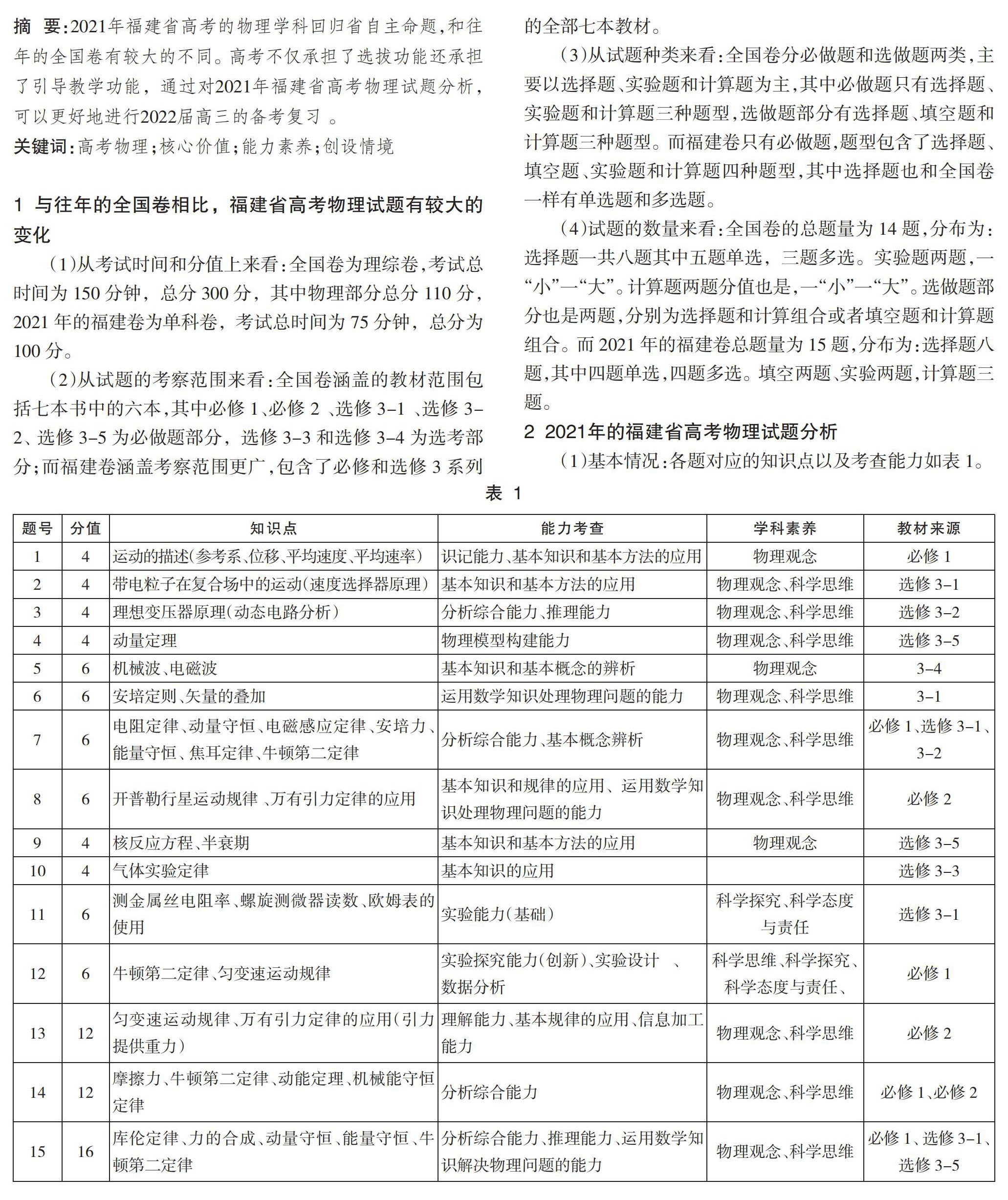 摘 要:2021年福建省高考的物理学科回归省自主命题,和往年的全国卷有较大的不同。高考不仅承担了选拔功能还承担了引导教学功能,通过对2021年福建省高考物理试题分析,可以更好地进行2022届高三的备考复习 。