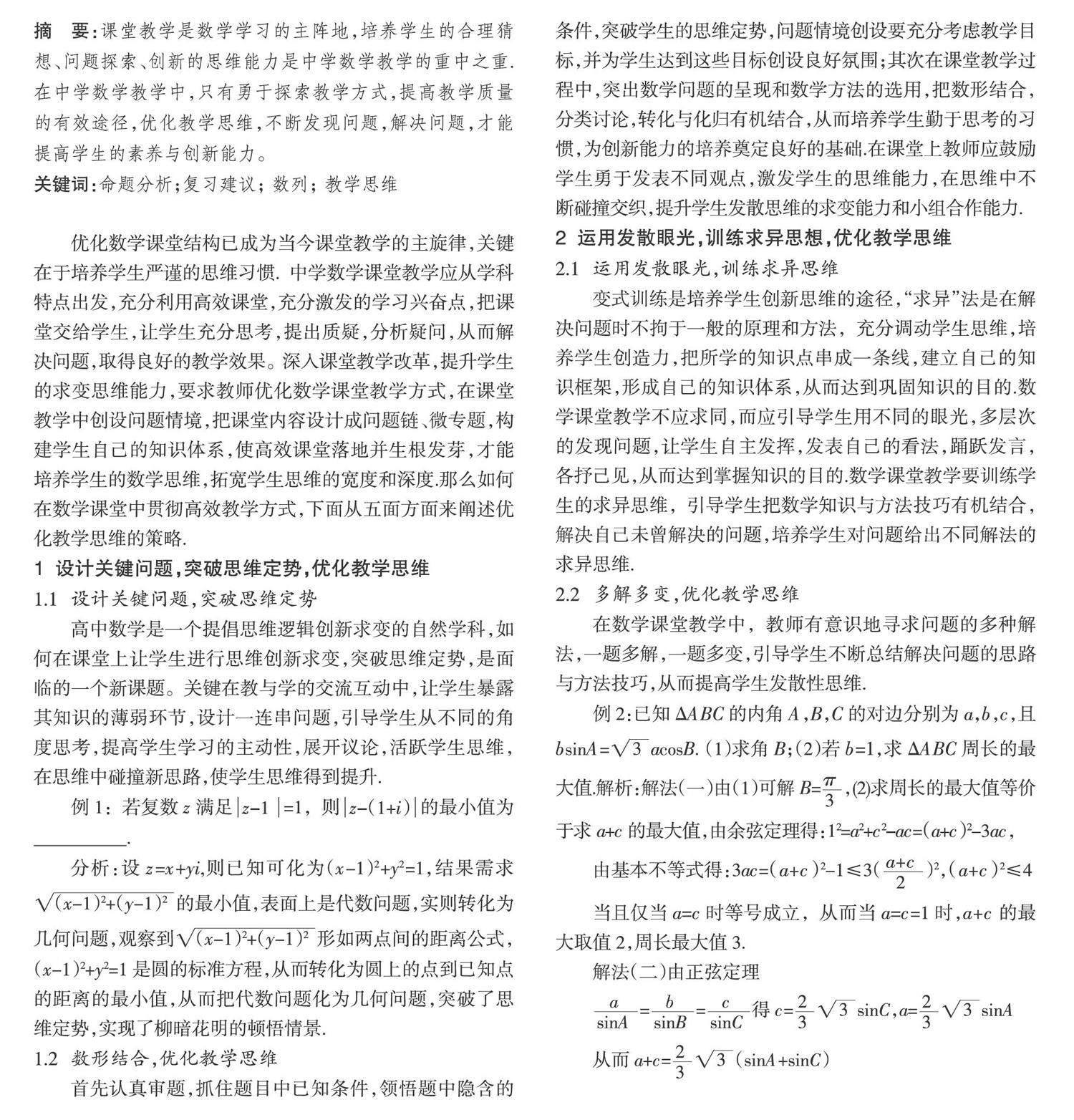 摘 要:课堂教学是数学学习的主阵地,培养学生的合理猜想、问题探索、创新的思维能力是中学数学教学的重中之重.在中学数学教学中,只有勇于探索教学方式,提高教学质量的有效途径,优化教学思维,不断发现问题,解决问题,才能提高学生的素养与创新能力。