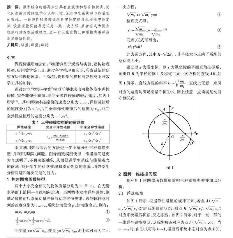 摘 要:数形结合的解题方法具有直观性和综合性特点,简化问题的同时降低学生认知门槛,促进学生系统观与能量观的落地。一维弹性碰撞遵循动量守恒定律与机械能守恒定律,设置变量将前者变式为二元一次方程、后者变式为圆方程以构建图像函数模型,进一步以此重构三种碰撞类型并应用其解决问题。