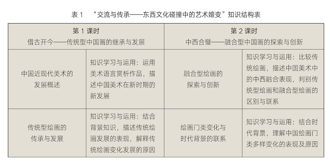 《普通高中美术课程标准(2017年版2020年修订)》中指出学生要了解近代以来中国美术的发展情况,探究民族文化传统的继承与发展的关系。本课选自人美版《美术鉴赏》第六单元“时代之镜——中国现代美术”主题一“交流与传承——东西文化碰撞中的艺术嬗变”。
