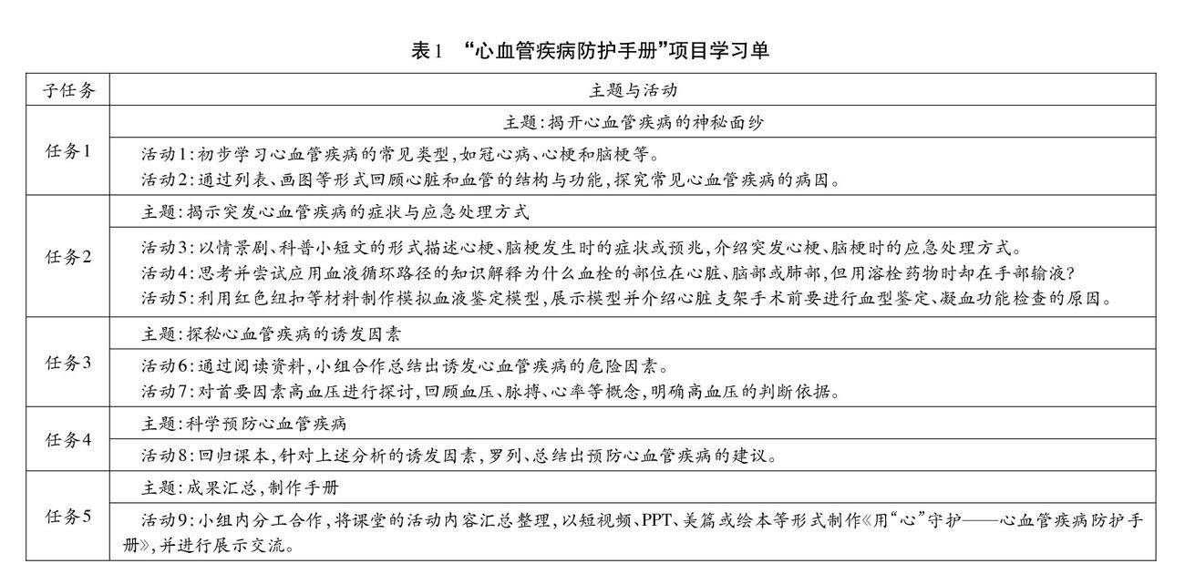 摘要 以“血液循环系统”的复习为例,运用项目化学习方式,引导学生了解心血管疾病的症状和应急处理、心血管疾病的诱发因素、如何科学预防心血管疾病,并引导学生制作心血管疾病防护宣传资料,运用学科知识整理总结心血管疾病的防护知识,提高对生物学学科价值的认识,培育科学态度与社会责任。