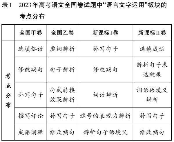 [摘 要]“语言文字运用”是高考重要的考查内容,能全面考查学生的语文学习能力和语文综合素养。高中语文教师应在关注阅读教学和写作教学的基础上,加大对此板块内容的研究和学习。