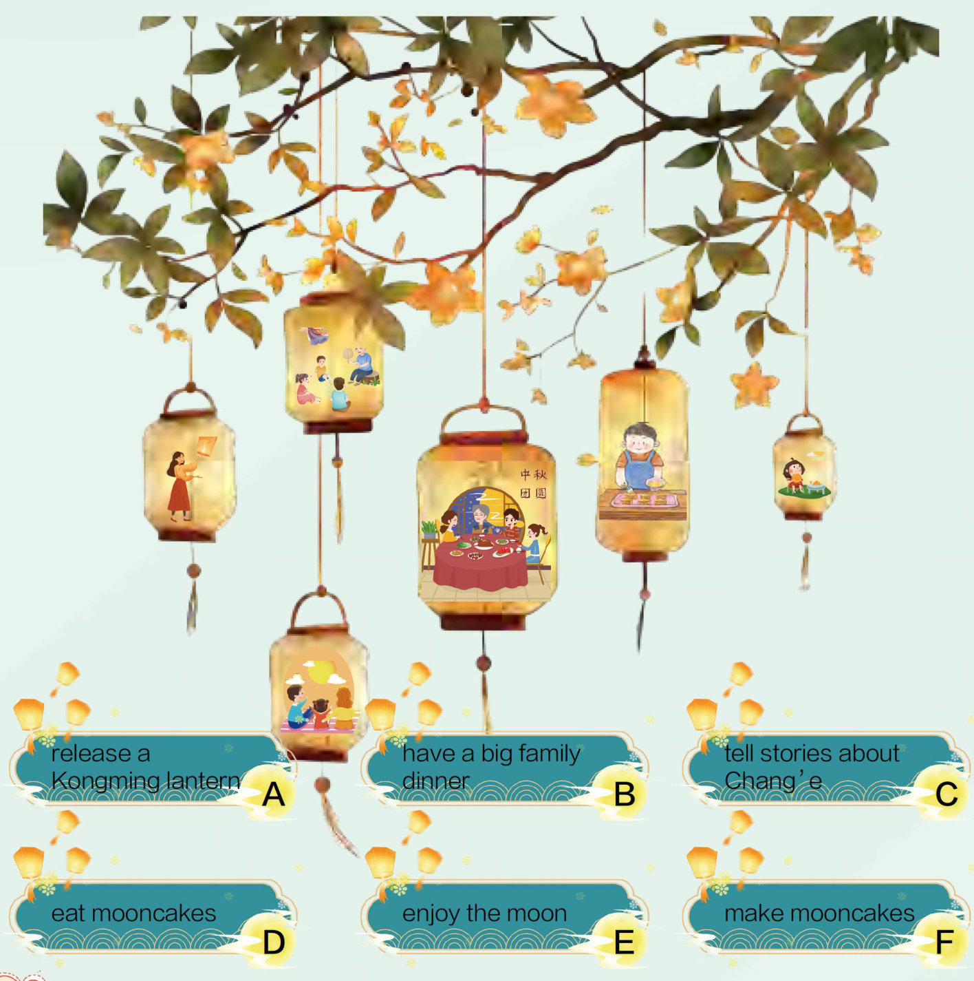 中秋节是中国特别重要的传统节日。在这一天,大家会开开心心地做很多有意思的事情。请你读一读下面的词组,再找找灯笼上对应的图片吧!