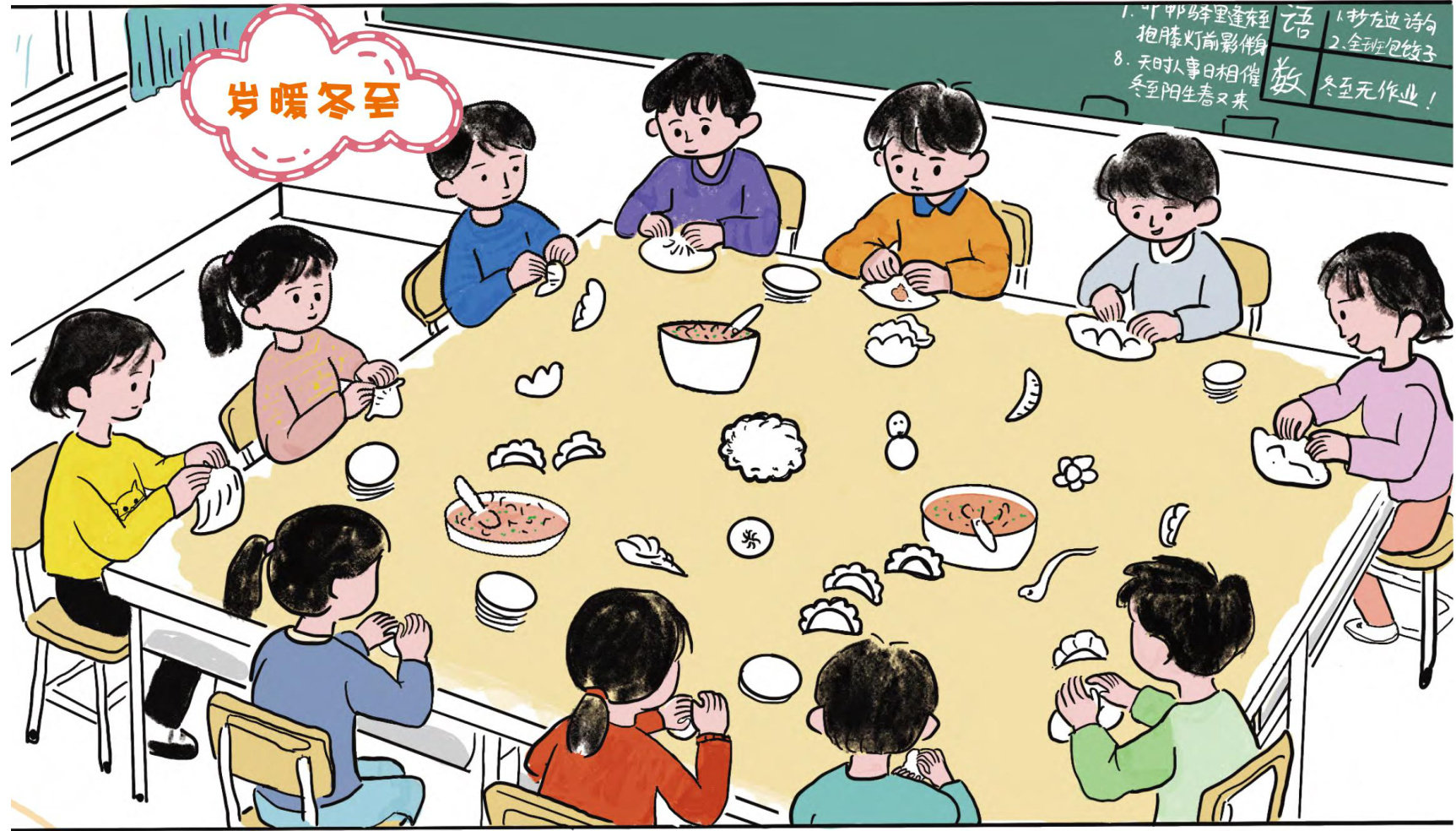 王老师站在讲台前搓着手,笑眯眯地宣布:“小馋猫们注意!马上冬至了,明天咱们全班一起一一包饺子!”