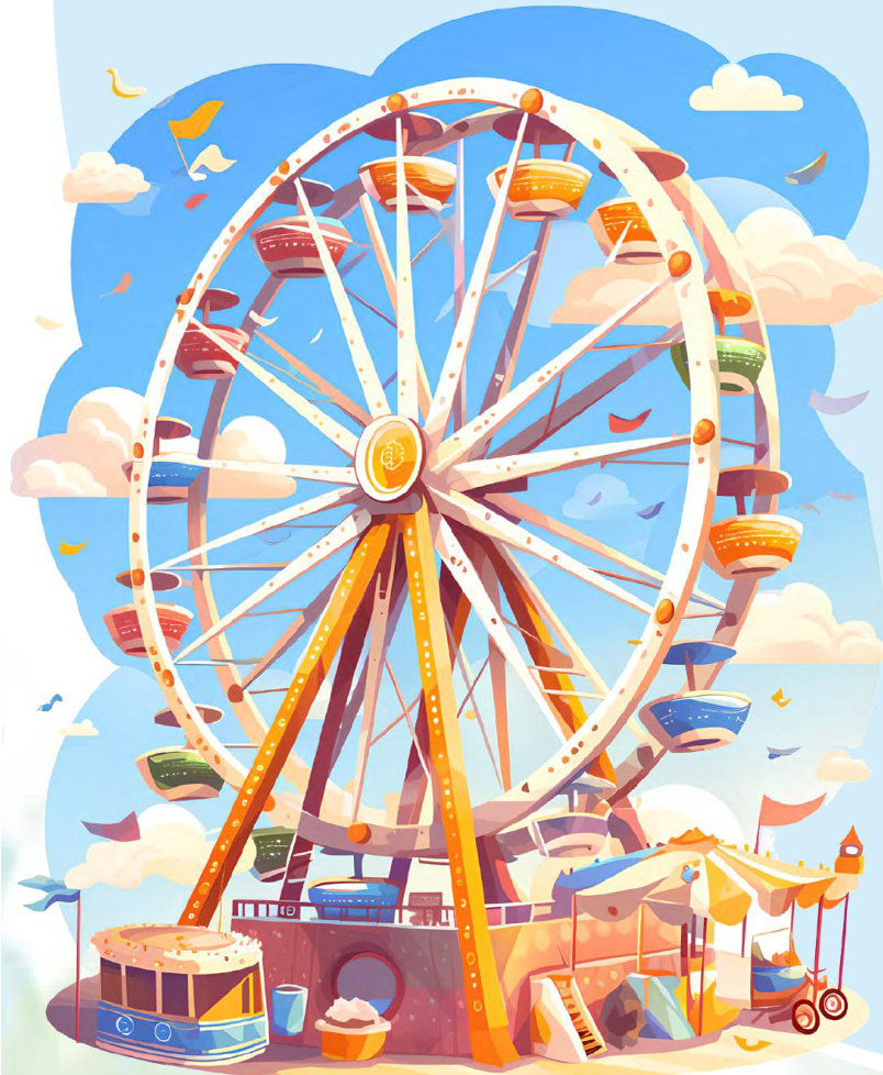 我站在下面抬头望,它像一个大大的甜甜圈挂在天上。排队的时候,我紧紧地抓住妈妈的手,心里像有只小麻雀在扑腾。我悄悄问妈妈:“我们坐上去后会不会掉下来呀?”妈妈蹲下来对我说:“别怕,它很安全,妈妈会一直陪着你的。”