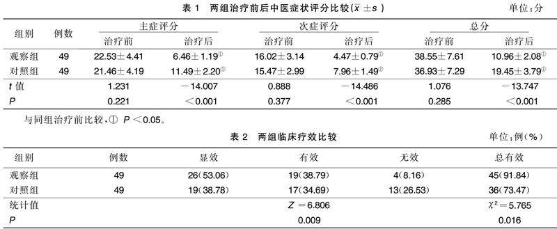 摘要 目的:观察益气活血、通阻养心方联合常规西药对心血瘀阻型冠心病慢性心力衰竭病人的影响。方法:选取2018年10月—2020年12月广州中医药大学第四临床医学院收治的98例心血瘀阻型冠心病慢性心力衰竭病人,采用随机数字表法分为对照组与观察组,各49例。对照组给予常规西药治疗,观察组给予常规西药联合自拟益气活血、通阻养心方治疗。(剩余7506字)