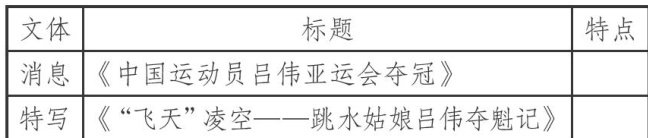 “活动·探究”单元,有“新闻阅读”“新闻采访”“新闻写作”三个明确的任务,其中安排的《“飞天”凌空一一跳水姑娘吕伟夺魁记》(以下简称《“飞天”凌空》)是一篇新闻特写。特写之“特”,“特”在何处?对于本单元的教学,着眼于新闻,仅梳理出“新闻要素”是不够的,还要针对不同新闻文体有更针对性的教学,比如新闻特写。(剩余4598字)