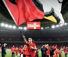2023中超联赛第29轮,上海海港vs山东泰山,赛后奥斯卡从球迷手里接过冠军旗帜,迎风挥舞。摄影/李铭珅 2018、2023赛季上海海港队两夺中超冠军,此外,球队还曾赢得1次中乙、1次中甲及1次中国超级杯冠军。目前,海港已经5座冠军奖杯在手...