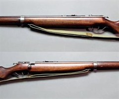 二战期间库伊公司为军方生产的Model 82训练步枪。该枪相当于Model 39的改进版,护木加长,并增加枪口箍和二箍,使其外观更接近于当时加拿大军队装备的李-恩菲尔德步枪 科堡镇工厂的一名工人正在对枪架上的Model 82训练步枪进行最后...