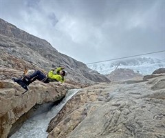 图为摄影师刘擎通过钢索渡河。何川老师说托雷峰就像是天堂,但去往天堂要经过地狱,而何老师口中的地狱便是攀登托雷峰的接近路线。从Chalten 出发至托雷峰脚下,单程距离便有38 公里且路途险象环生,图中为冰川融水形成的河流峡谷,也是去往托雷峰...