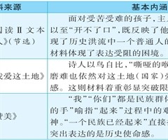 题目中有三则引语,第一则引语来自该卷中的现代文阅读《鼓书艺人》(节选),这是老舍1948至1949年间写成的长篇小说,讲述的是抗战期间鼓书艺人方宝庆一家逃难到重庆之后经历的诸多痛苦与不幸。第二则引语是艾青于1938年写下的现代诗《我爱这土地...