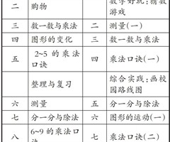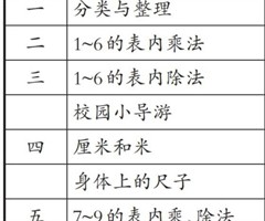 苏教版新教材二年级上册,包括六个自然单元(1~6的表内乘法,1~6的表内除法,7~9的表内乘除法,认识三位数,两位数加、减两位数,有余数的除法)和三个综合与实践活动(奇妙的七巧板,生活中的方向,欢乐购物街)。这六个自然单元都属于数与代数领域...