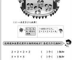 为了帮助学生建构乘法的概念,苏教版新教材将原来二年级上册“表内乘法(一)”单元第一课时“认识乘法"分为了两课时(“几个几相加”和“认识乘法”),旨在降低学生学习的难度,深化学生乘法概念建构的学程,让学生能更好地理解乘法的意义。“几...