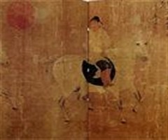 唐·游骑图 绢本设色 22.7cmX94.8cm 北京故宫博物院藏 唐·游骑图(局部) 唐·游骑图(局部) 此图作者不祥,所绘制内容是唐朝仕宦贵族骑马出游的场面。画中有两人步行,三人骑在马上前行,位于中间的一位...