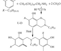 摘要:为改善普通苯并噁嗪开环聚合温度较高、脆性较大的不足,研究制备了一种含有酚羟基和长烃基链的漆酚-十二胺型苯并噁嗪(U-D)作为催化和增韧改性剂。差示扫描量热和凝胶化时间测试结果表明,U-D较易发生开环聚合(起始和峰值温度分别为 117....