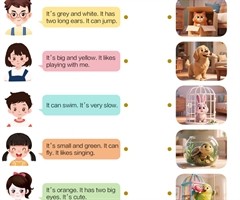 小朋友正在介绍自己的小宠物,请你根据他们的描述猜一猜并连线。下面是为自己的宠物设计的介绍卡片。请你读一读,并为自己的宠物也设计一张介绍卡片吧 Pet Information Card A hamster Name: Huahua Color...