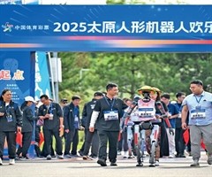 2025太原人形机器人欢乐跑暨人工智能成果展示活动上,人形机器人在“主人”陪伴下跑出起点。 9月20日,在山西省太原市晋阳湖公园的桃花岛上,来了一群特殊的马拉松“参赛者”,21台人形机器人齐聚于此,一场充满科技感的“2025太原人形机器人欢...
