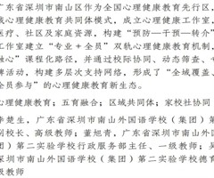 2023年,教育部等十七部门印发《全面加强和改进新时代学生心理健康工作专项行动计划(2023一2025年)》,明确提出“健全多部门联动和学校、家庭、社会协同育人机制”的要求。广东省深圳市南山区作为全国心理健康教育先行区,率先探索区域心理健康...