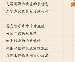 树的朋友圈 是记录成长的日记本 春芽萌动时 集体换头像 所有枝桠都举着鹅黄色标点 风在评论区轻轻翻页 第一朵花开 那是通知全体成员的红色提示符 鸟窝刚弹出破壳的表情包 点赞声就从根系漫到树梢 晨光给每片叶子开直播 树把昨夜的星星梦 加上好看...