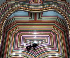 当地时间2025年12月8日加拿大不列颠哥伦比亚省温哥华,人们在温哥华美术馆参观格拉斯哥艺术家、音乐家吉姆·兰比的《佐波普》展览。“佐波普”是艺术家持续进行的带有迷幻效果的地面设计的系列总称。作品完全由乙烯基胶带制成,其中的颜色及...