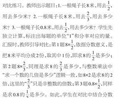 摘要:本文着重关注“乘法一致性”在小学数学计算教学中的实践途径,运用“借助生活中的具体实例来分析本质”“通过操作体验把算理串联起来”“开展对比练习以突显规律”这三项策略,引领学生掌握整数乘法、小数乘法、分数乘法的一致性,其目的在于增强乘法认...